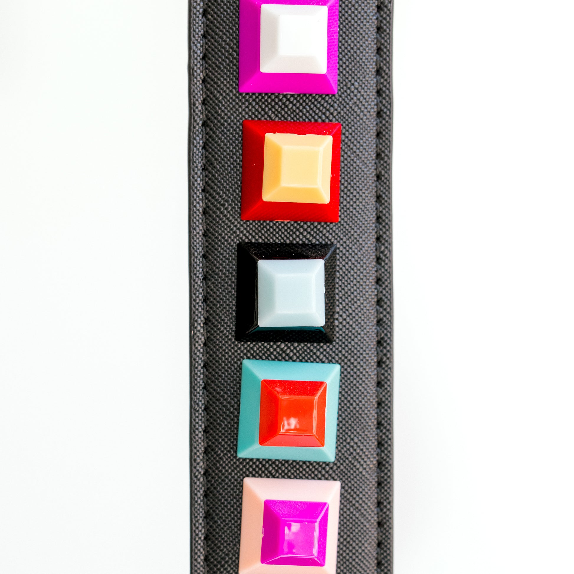 Black leather strap with multi-colored pop detail and gold hardware. Dimensions: 41.5" x 1.5"