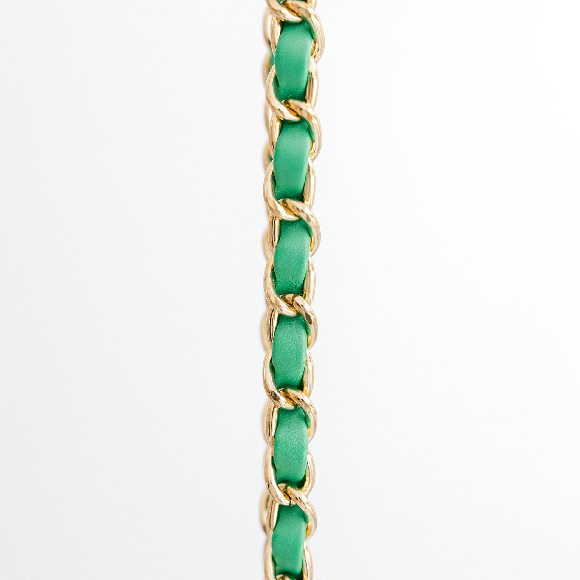 Chain link strap interlaced with vegan green leather. Dimensions: 47" x 0.75"