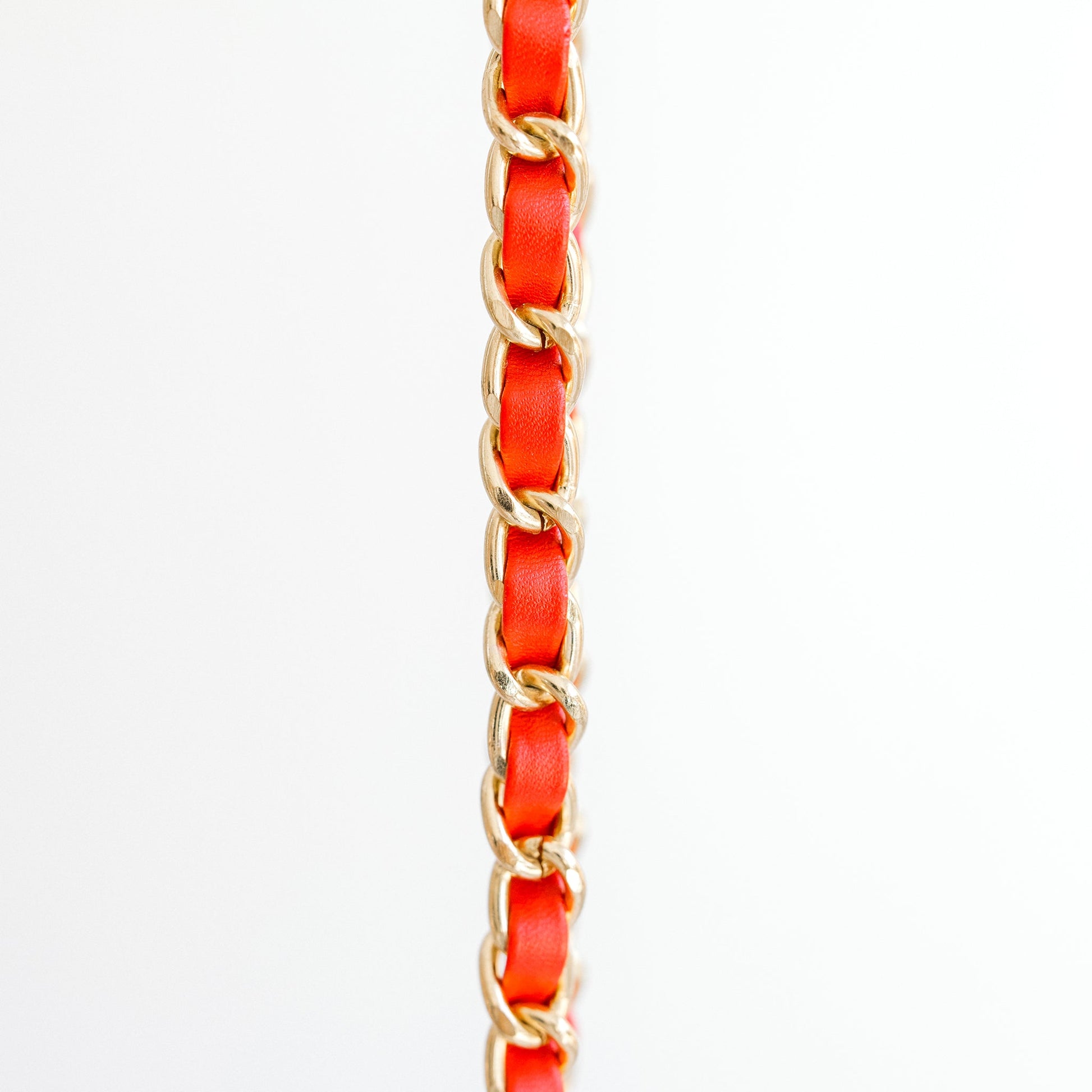 Chain link strap interlaced with red leather. Dimensions: 47" x 0.75"