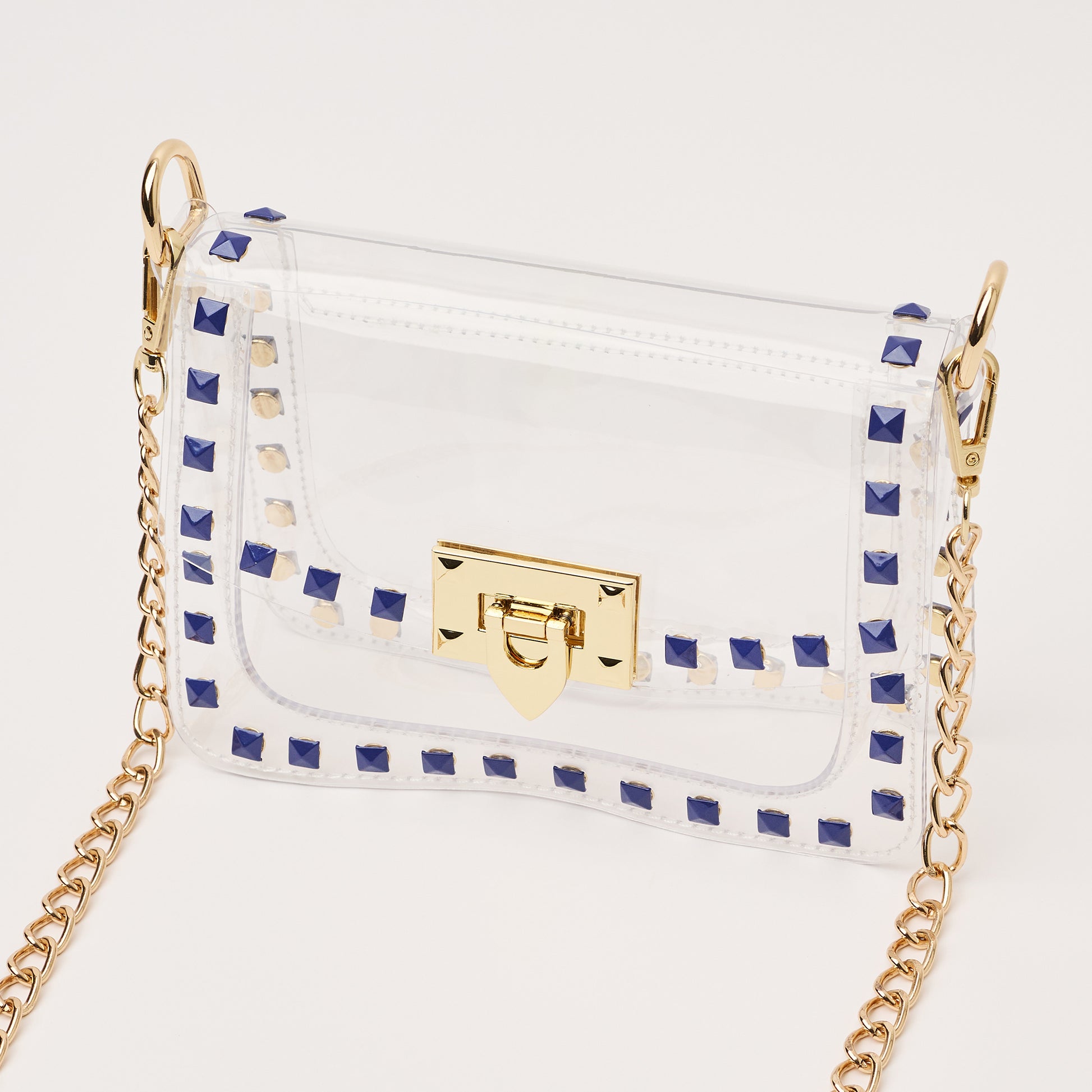 Score with the biggest winner in our clear handbag playbook - The Jackie! The Jackie changed the handbag game by proving clear handbags could be both functional and chic. This style includes royal blue square metal studs and a gold chain. The Jackie is NCAA and NFL compliant and the ideal size to hold your wallet, phone, keys, lip gloss, and a few other small items.