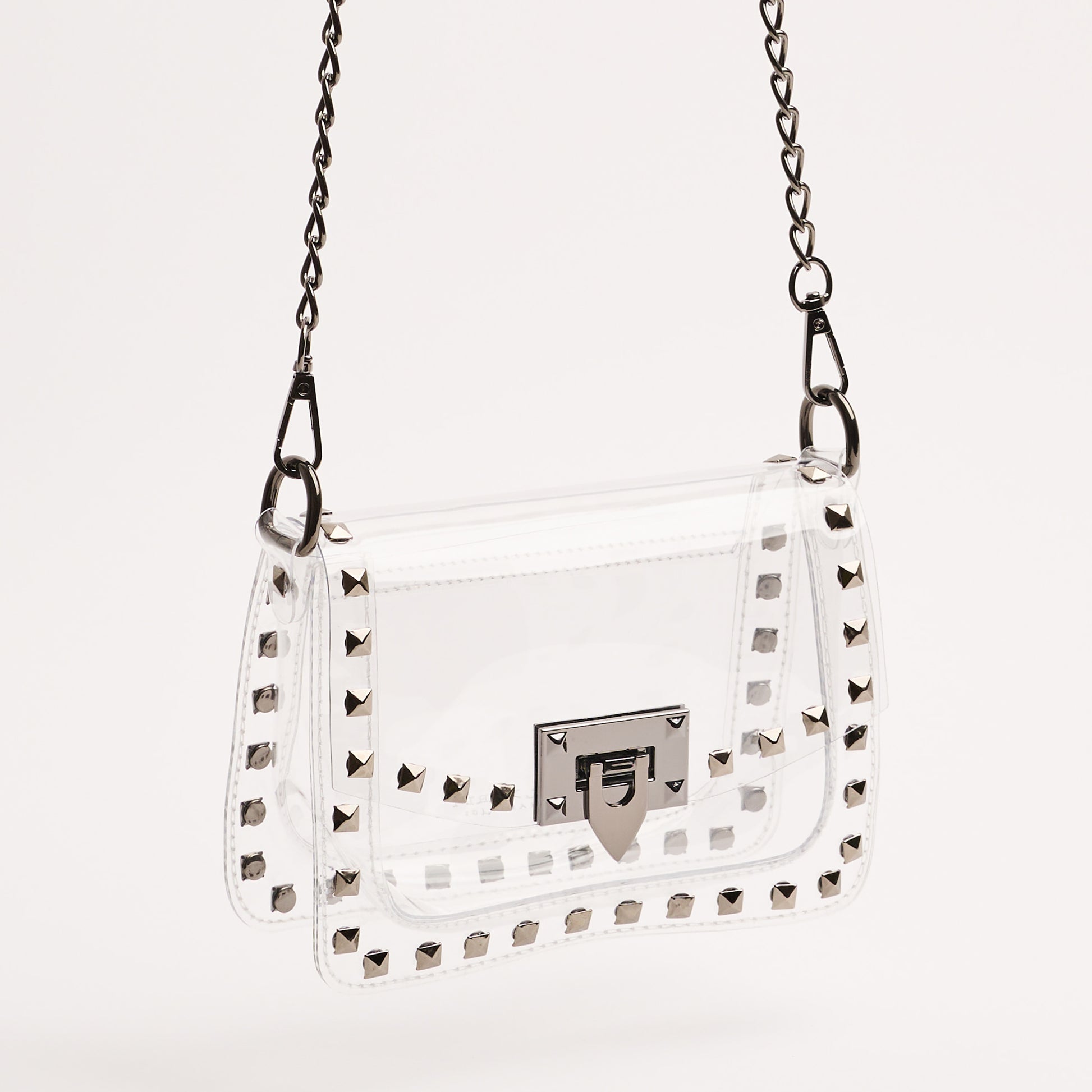 Score with the biggest winner in our clear handbag playbook - The Jackie! The Jackie changed the handbag game by proving clear handbags could be both functional and chic. This style includes gunmetal square metal studs and a gunmetal chain. The Jackie is NCAA and NFL compliant and the ideal size to hold your wallet, phone, keys, lip gloss and a few other small items.