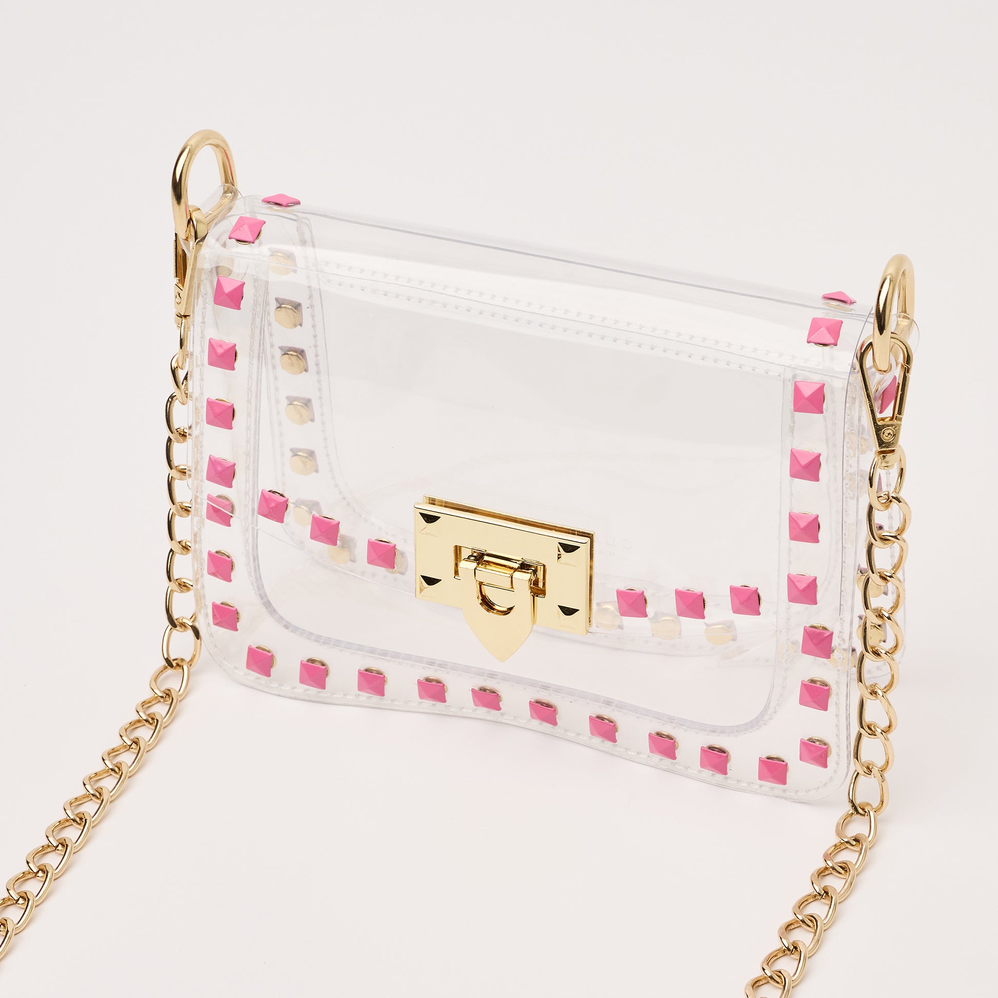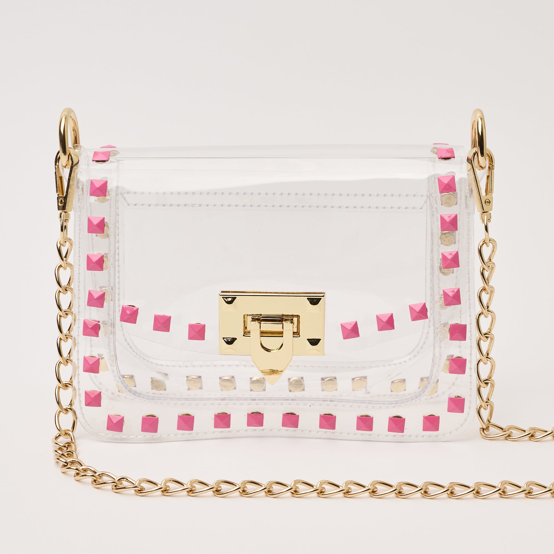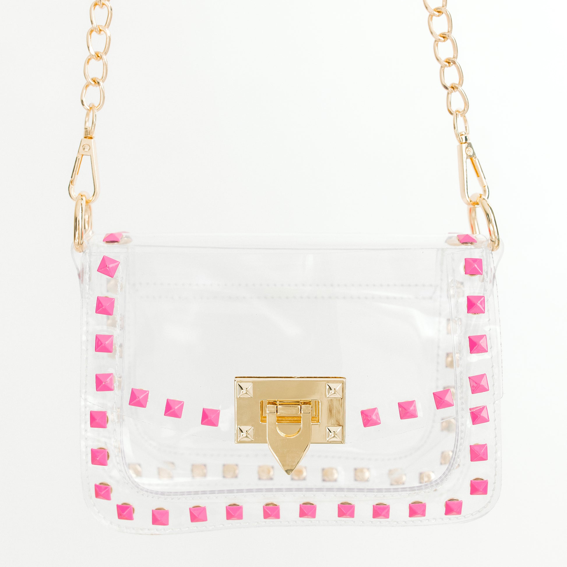 Score with the biggest winner in our clear handbag playbook - The Jackie! The Jackie changed the handbag game by proving clear handbags could be both functional and chic. This style includes bright pink square metal studs and a gold chain. The Jackie is NCAA and NFL compliant and the ideal size to hold your wallet, phone, keys, lip gloss, and a few other small items.