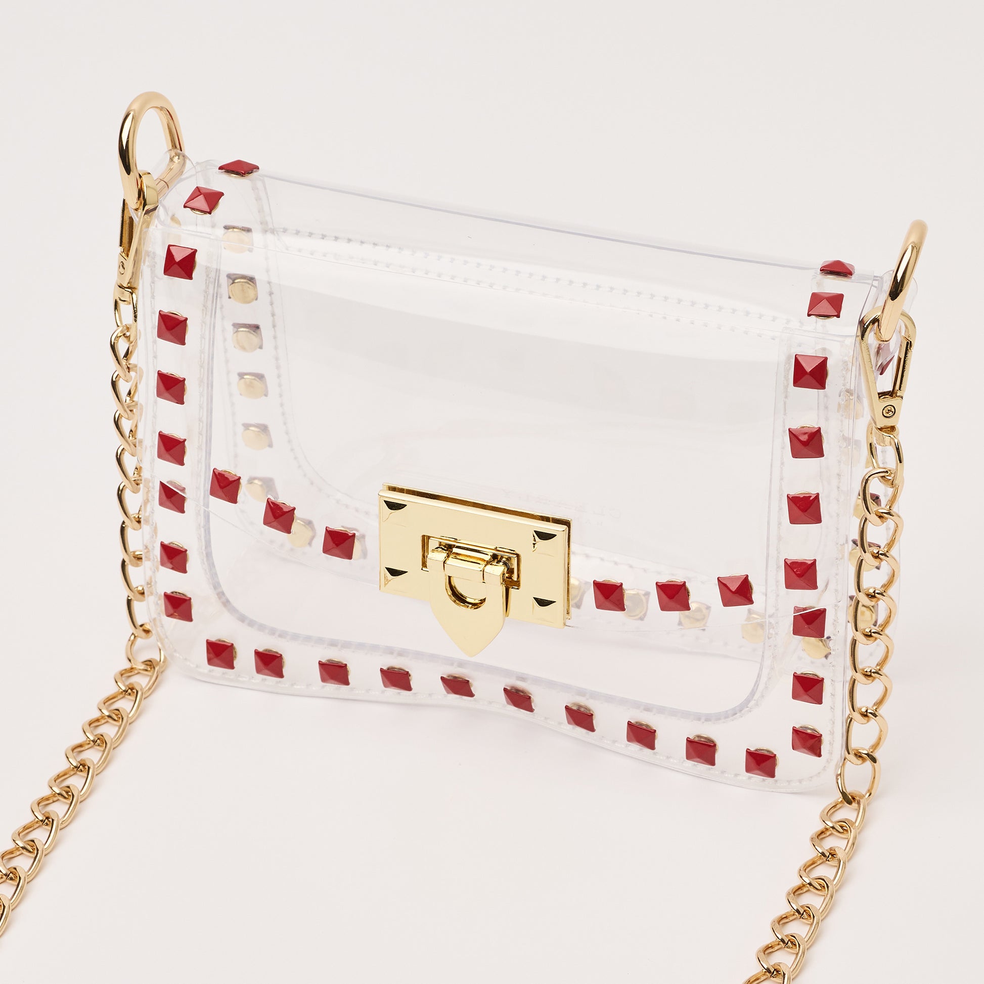 Score with the biggest winner in our clear handbag playbook - The Jackie! The Jackie changed the handbag game by proving clear handbags could be both functional and chic. This style includes red square metal studs and a gold chain. The Jackie is NCAA and NFL compliant and the ideal size to hold your wallet, phone, keys, lip gloss, and a few other small items.