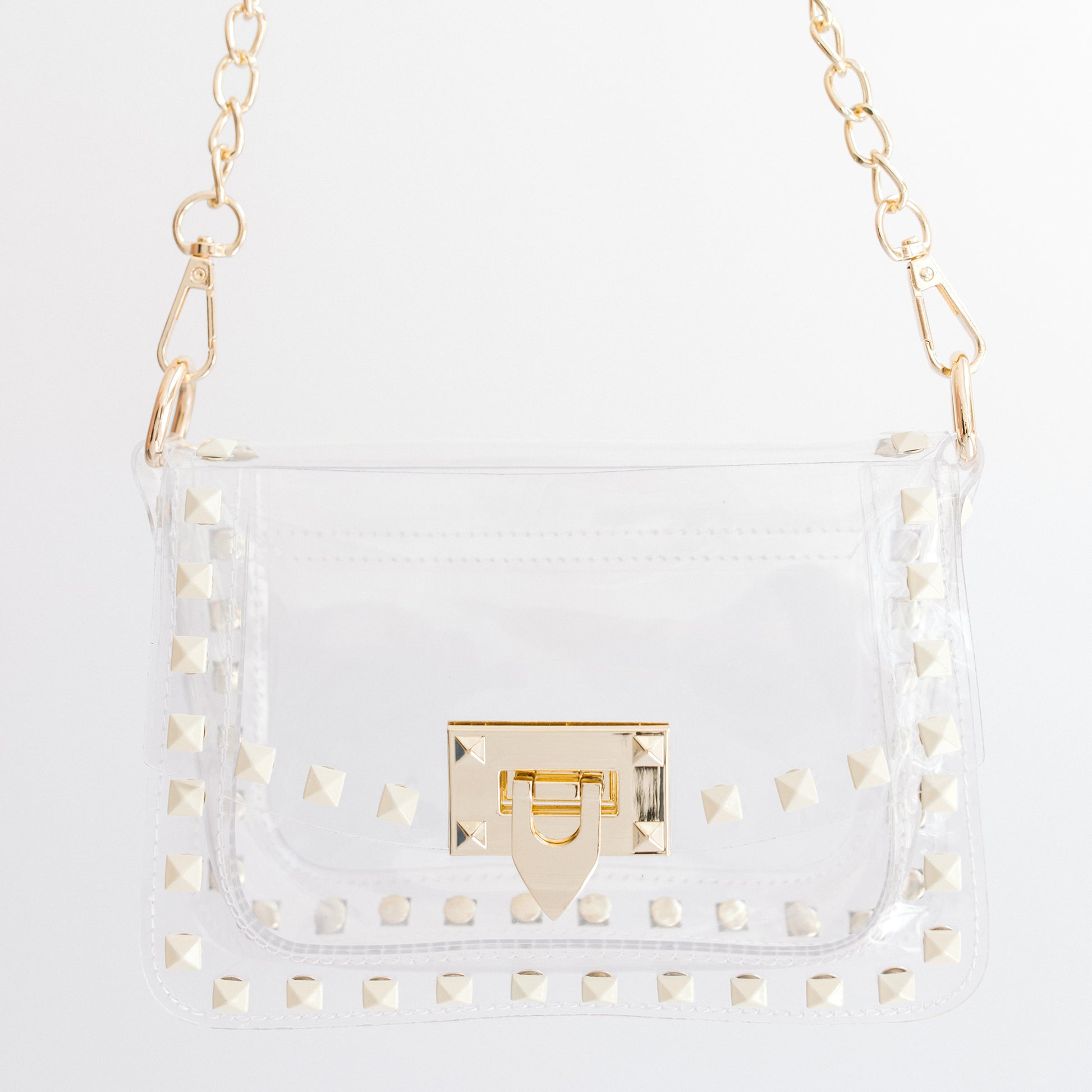 Score with the biggest winner in our clear handbag playbook - The Jackie! The Jackie changed the handbag game by proving clear handbags could be both functional and chic. This style includes white square metal studs and a gold chain. The Jackie is NCAA and NFL compliant and the ideal size to hold your wallet, phone, keys, lip gloss and a few other small items.