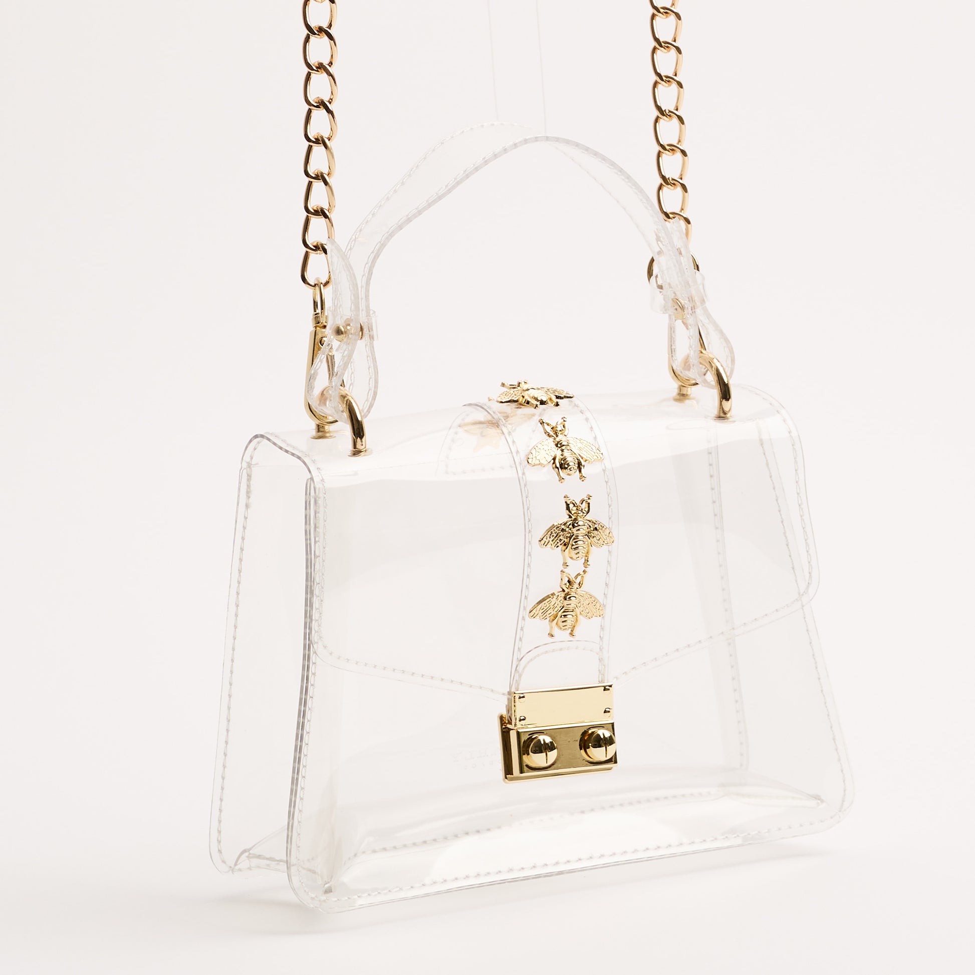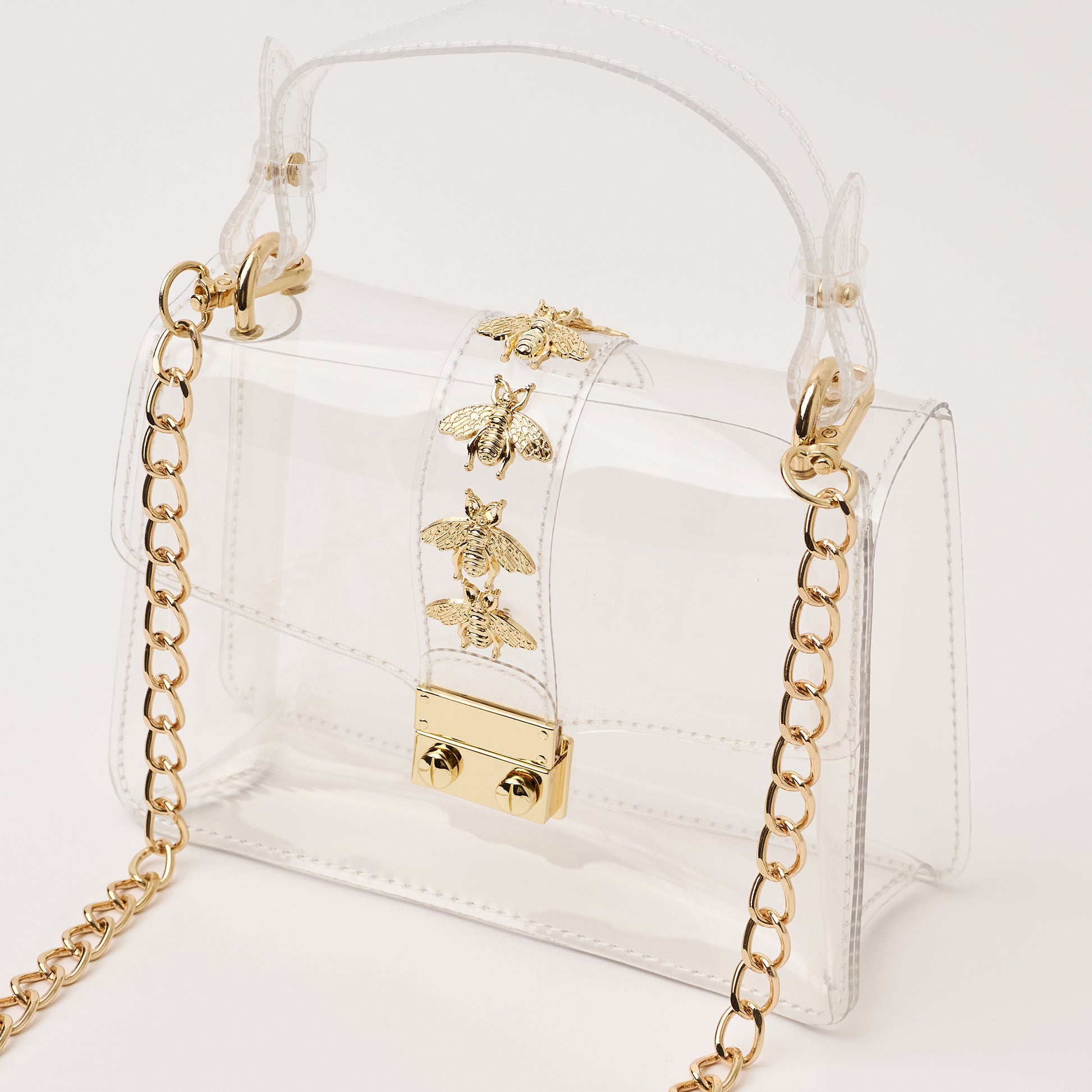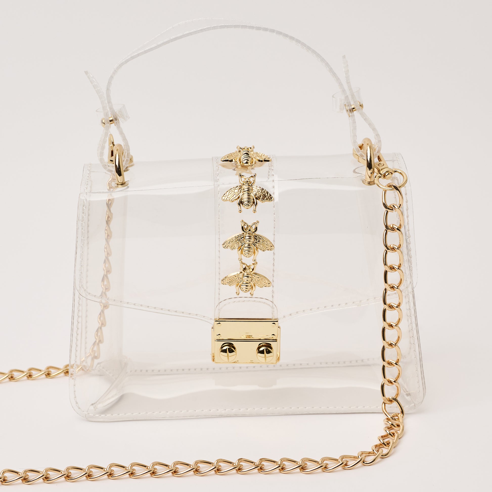 Come see what all the BUZZ is about with Clearly's Kathryn in Bee! This style includes gold bee accent studs and a gold chain. The Kathryn is NCAA and NFL compliant and the ideal size to hold your wallet, phone, keys, lip gloss, and a few other small items.